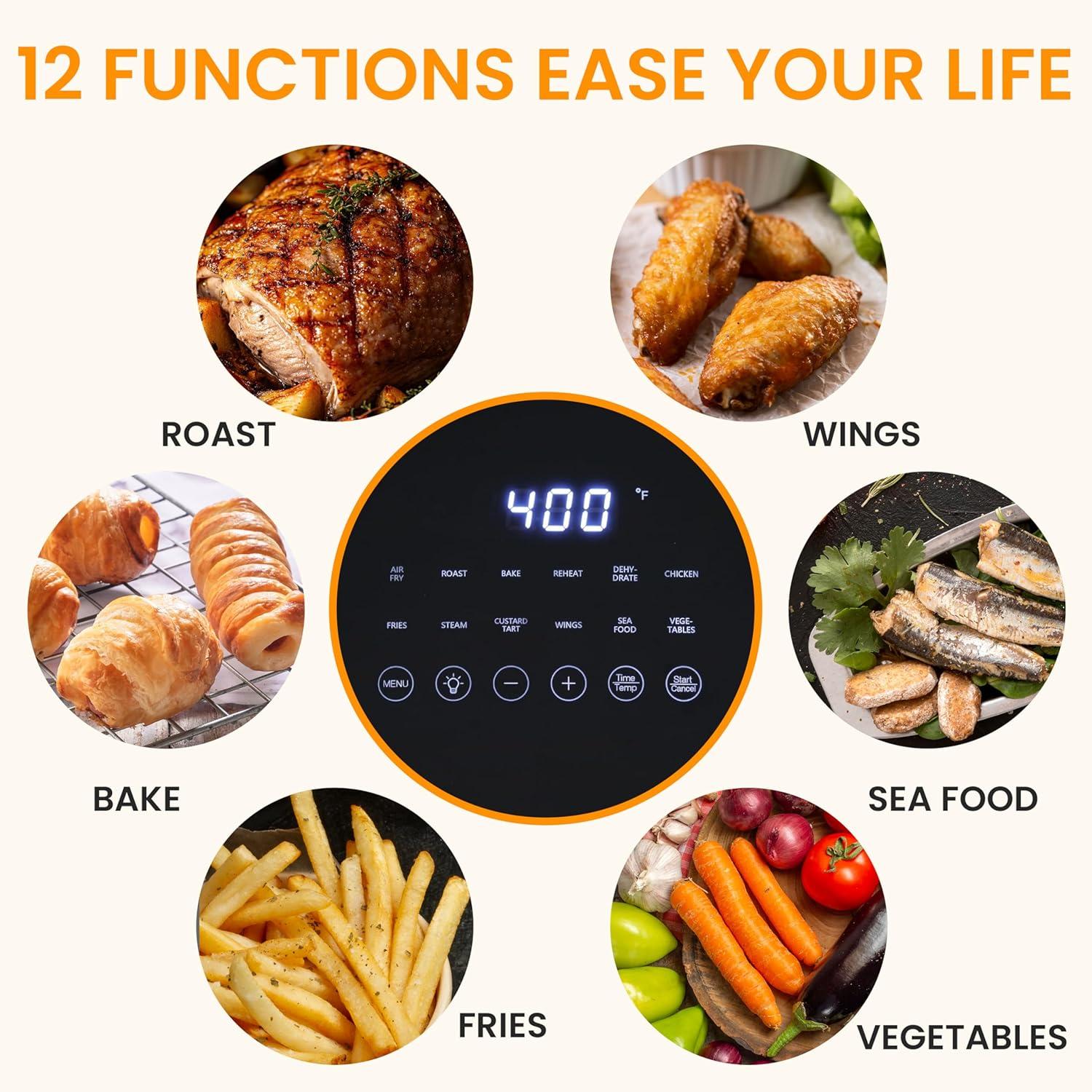 12-in-1 Digital Smart Cooking: Simplify every meal with 12 one-touch presets on this Air Fryer Oven. From crispy Air Fry fries and juicy Roast chicken to healthy Dehydrate snacks, making homemade favorites faster and easier