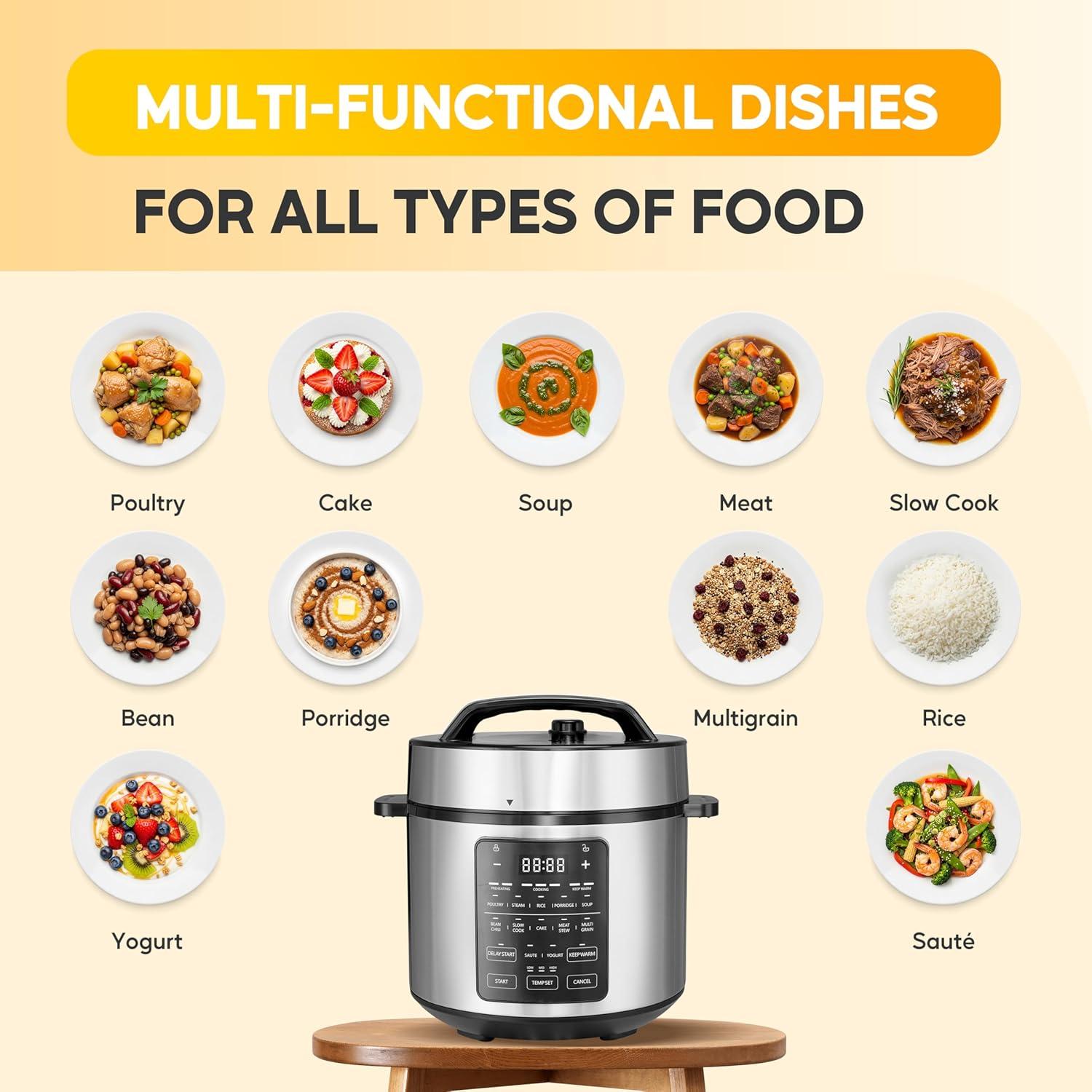 12-in-1 Functionality: This multi-cooker expertly sautés, steams, slow cooks, rice cooks, and more, replacing multiple appliances. Whip up everything from seared meats to yogurt effortlessly, saving you precious time and counter space. Selection Advice: Choose a 6-quart model for families of 3-4 people, and 8-quart model for families with more than 5 people