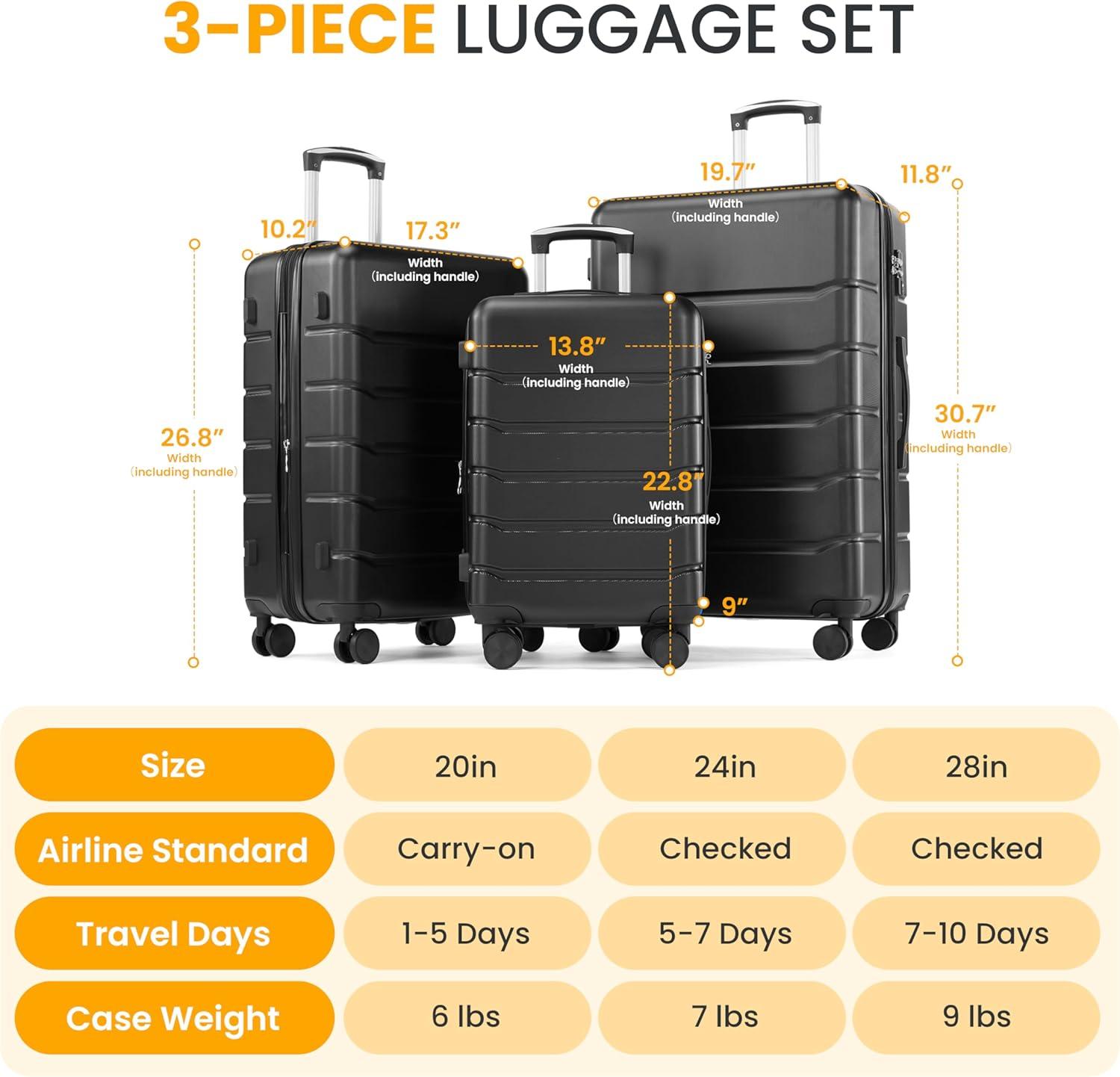 Product Dimensions: Our spinner luggages are available in 20 inch(13.8″L x 9.1″W x 22.8″H), 24 inch(17.3″L x 10.2″W x 26.8″H) and 28 inch(19.7″L x 11.8″W x 30.7″H) for work travel, vacations, or as international carry-on.
