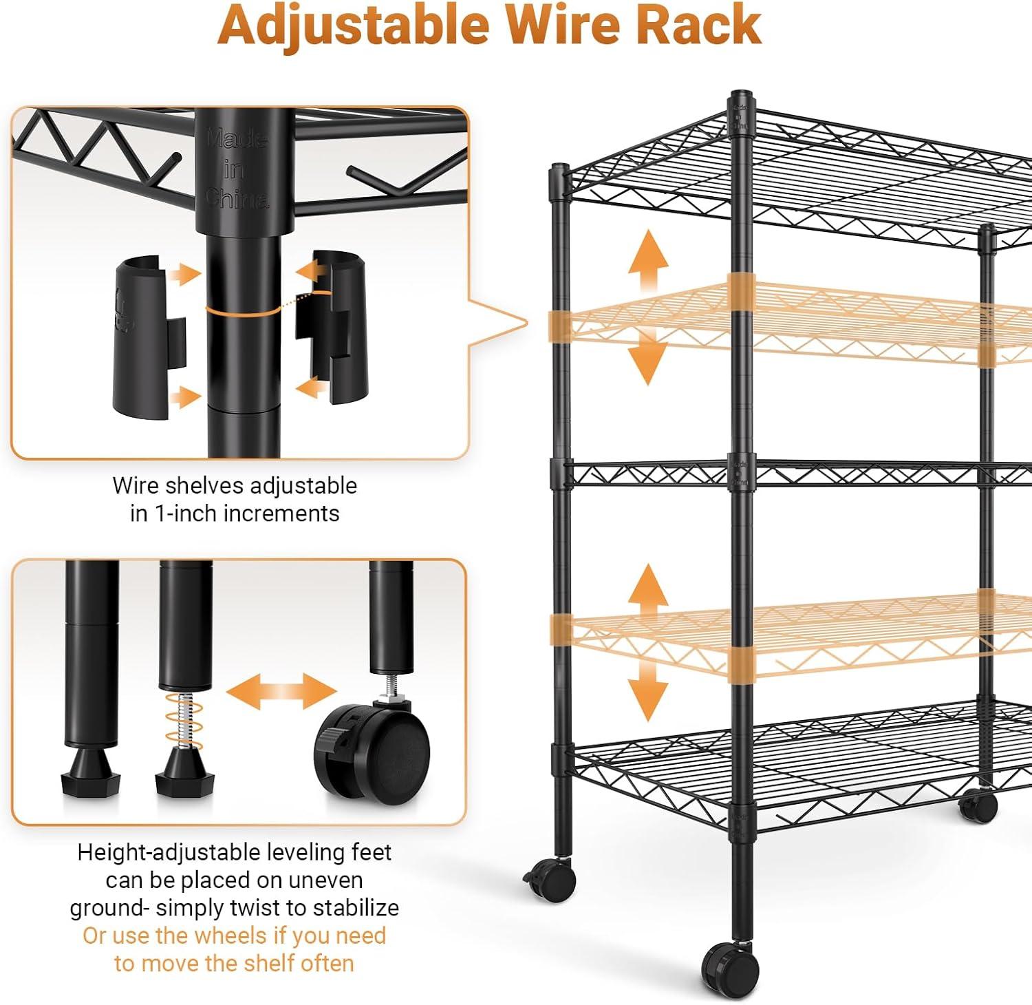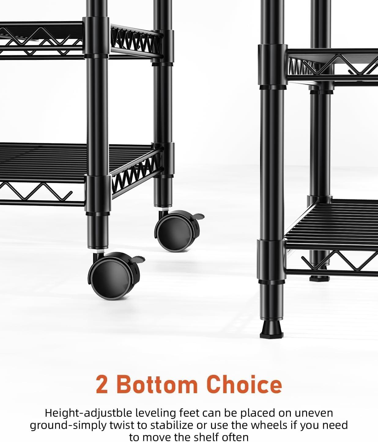 Adjustable Design with Wheels – Features durable steel construction with adjustable leveling feet and four wheels for mobility. Shelves adjust in 1-inch increments for customizable storage.