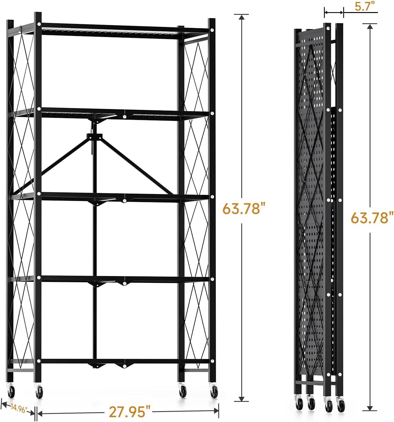 HealSmart Heavy Duty 4-Tier Foldable Metal Rack, 14.96″ D x 27.95″ W x 49.61″ H Storage Shelving Unit 1000 lbs with Wheels Moving Easily Organizer Shelves Great for Garage Kitchen, Black(5-Shelf)