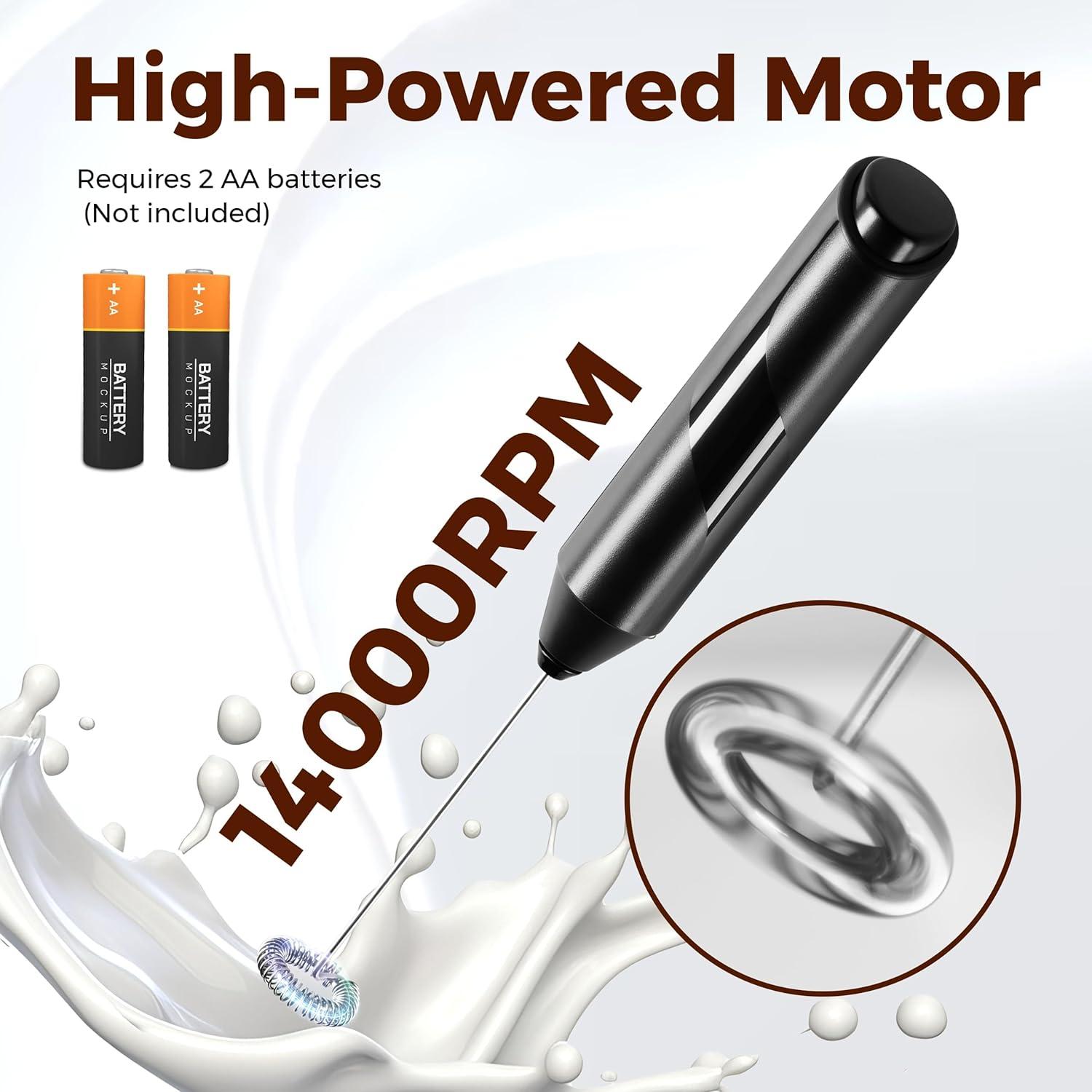Make foam faster: Running at speeds of up to 14,000 RPM, our milk frother machines only take you 10-20 seconds to make a rich foam. It is powered by 2 AA batteries (Not included) can be used more than 1000 times
