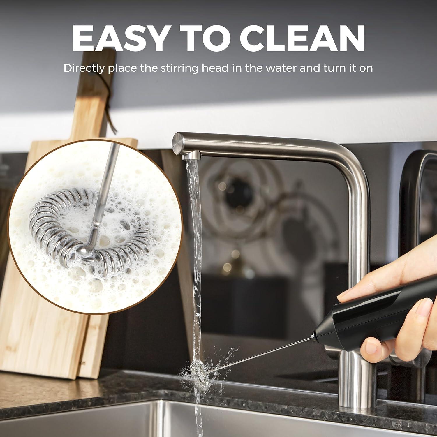 Easy to use: Our milk bubbler has been redesigned to operate with the push of a button. There is no need for complicated steps, even the elderly or children can do it. When you need to clean it, put it in water, press the button, and spin it clean